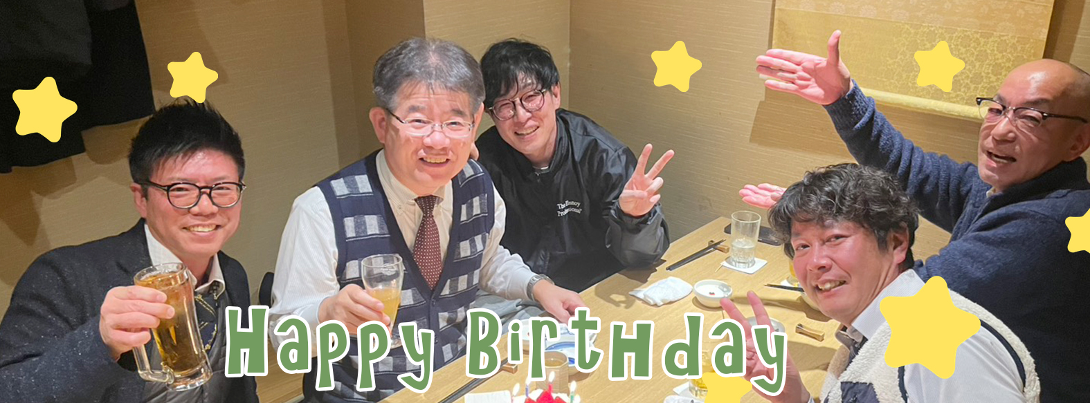 | <主役のメッセージ> 日は素敵な誕生日のお祝いをありがとうございました!皆様に温かく祝っていただき、改めて身の引き締まる思いです。この一年も感謝の気持ちを大切に、さらなる成長を目指して精一杯業務に取り組んでまいります。お忙しい中、お時間を割いてくださった皆様、本当にありがとうございました。Y.Y |
